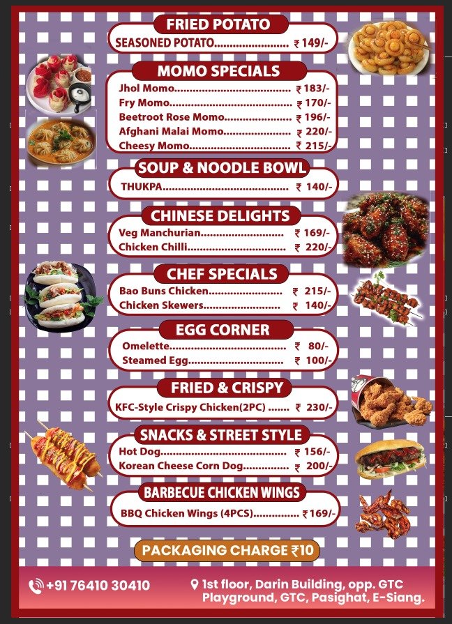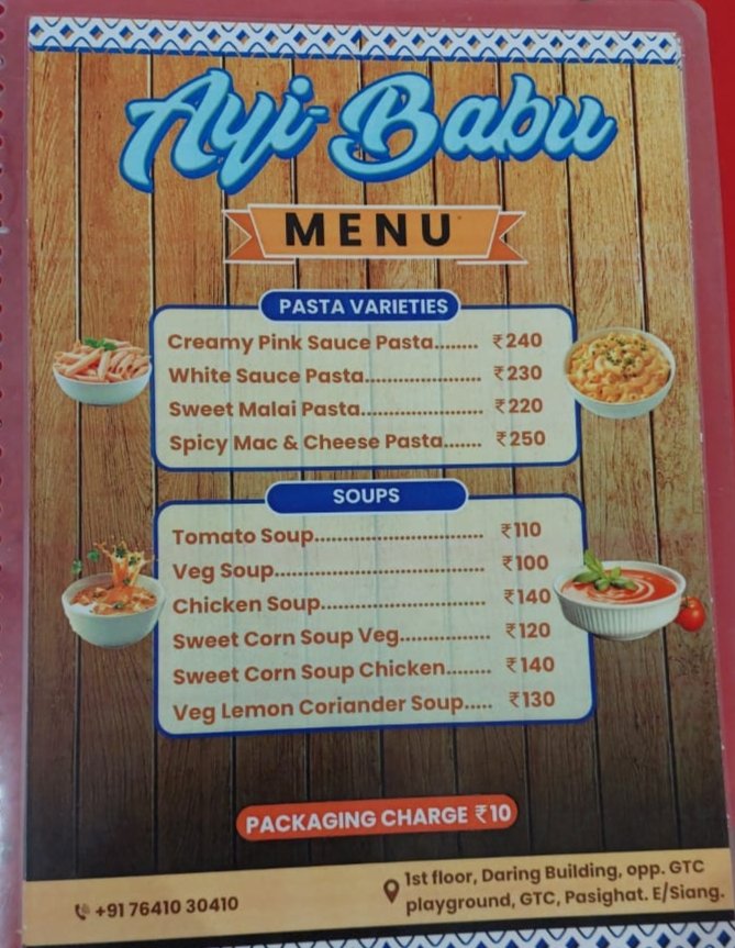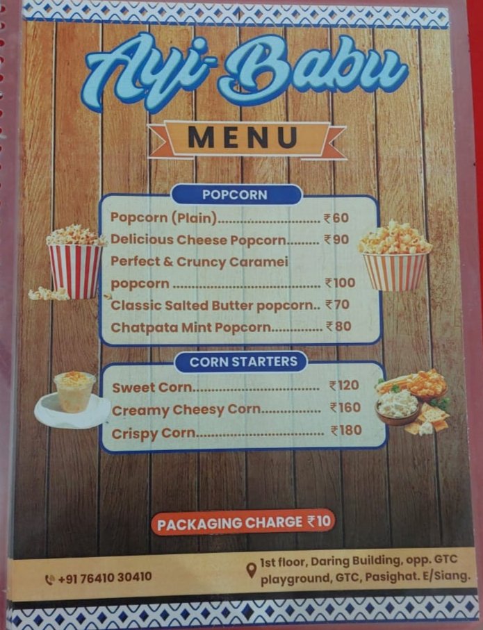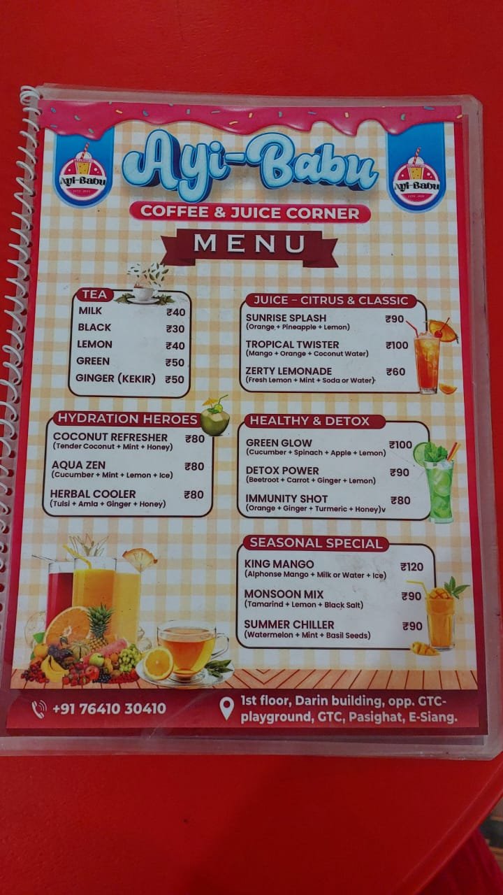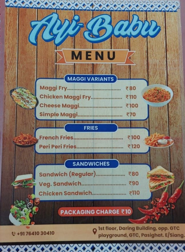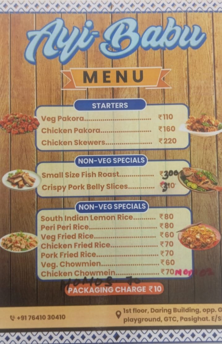 Ayi Babu Café cum Resturant a multi-cuisine offering a wide variety of fresh juices, milkshakes, protein shakes, premium coffees, mojitos, fruit salads, soups, pasta, momos, fried snacks, rice bowls, chicken wings, street-style snacks, maggie,sandwiches and more. We serve both veg and non-veg options including momos, bao buns, chicken skewers, fried rice, chowmein, lemon rice, peri peri rice, crispy chicken, pork belly slices, fish roast and BBQ wings. Known for our fresh ingredients, hygienic preparation and quick service, Ayi Babu Café cum Resturent the perfect spot for friends, families and students to enjoy tasty drinks, comfort food and affordable meals under one roof. Great taste • Fast service • Clean space • Wide menu variety